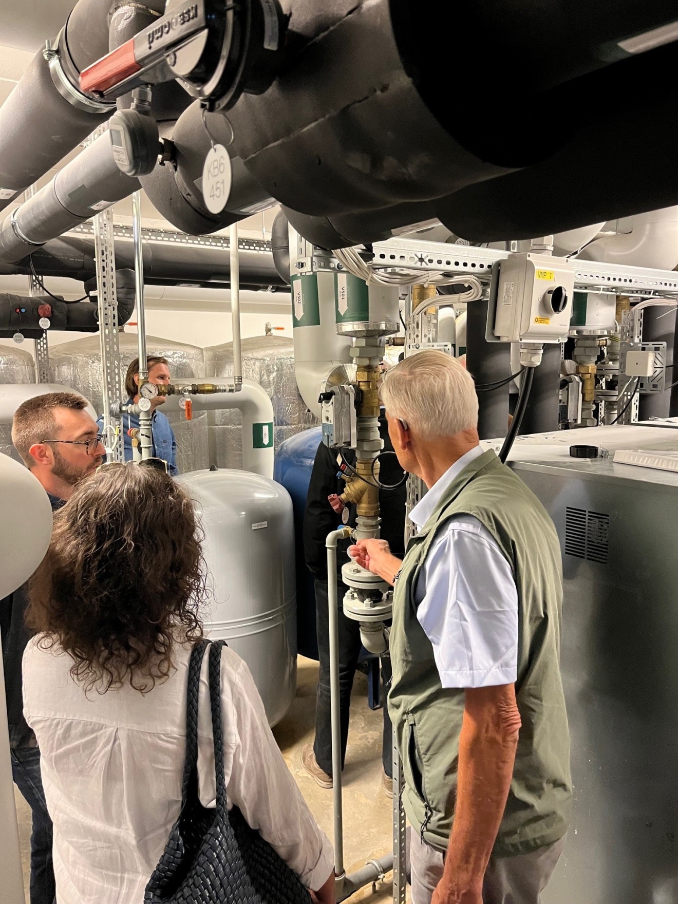 Under rundvandringen berättade representanter från Sveafastigheter om tekniska lösningar, driftstatistik och erfarenheter från olika system som testats och utvärderats. Fastigheten producerar mer energi än den förbrukar genom 1 210 kvm solceller, bergvärme, golvvärme och värmeåtervinning, och uppnår Energiklass A enligt energideklarationen.